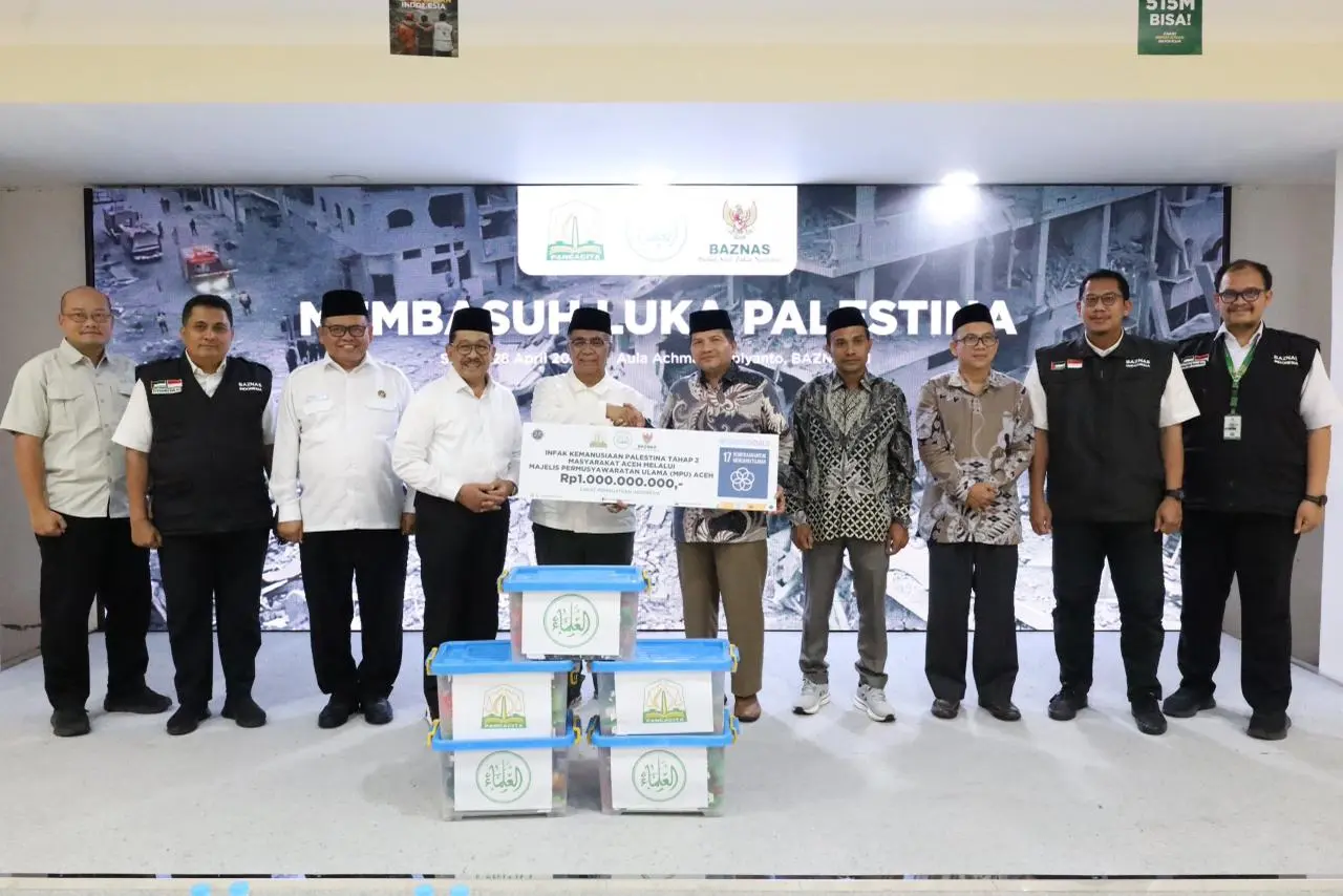 Masyarakat Aceh kembali menunjukkan solidaritas global dengan menyalurkan infak kemanusiaan sebesar Rp1 miliar untuk rakyat Palestina melalui BAZNAS RI, Selasa, 28 April 2026. [Foto: BAZNAS]