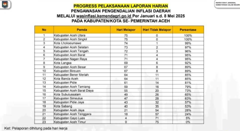 Capaian kinerja pelaporan harian pengendalian inflasi di Aceh menunjukkan bahwa selain Kabupaten Aceh Utara dan Kabupaten Aceh Singkil yang mencapai 100%, Kota Lhokseumawe berada di posisi selanjutnya dengan 99%, diikuti oleh Kabupaten Aceh Selatan (97%), Kabupaten Aceh Tengah (96%), serta Kabupaten Aceh Barat dan Kabupaten Nagan Raya yang sama-sama mencatatkan angka 95%. Kota Langsa mencatat 92%, Kabupaten Aceh Besar 89%, Kabupaten Bireuen 88%, dan Kabupaten Bener Meriah 85%.