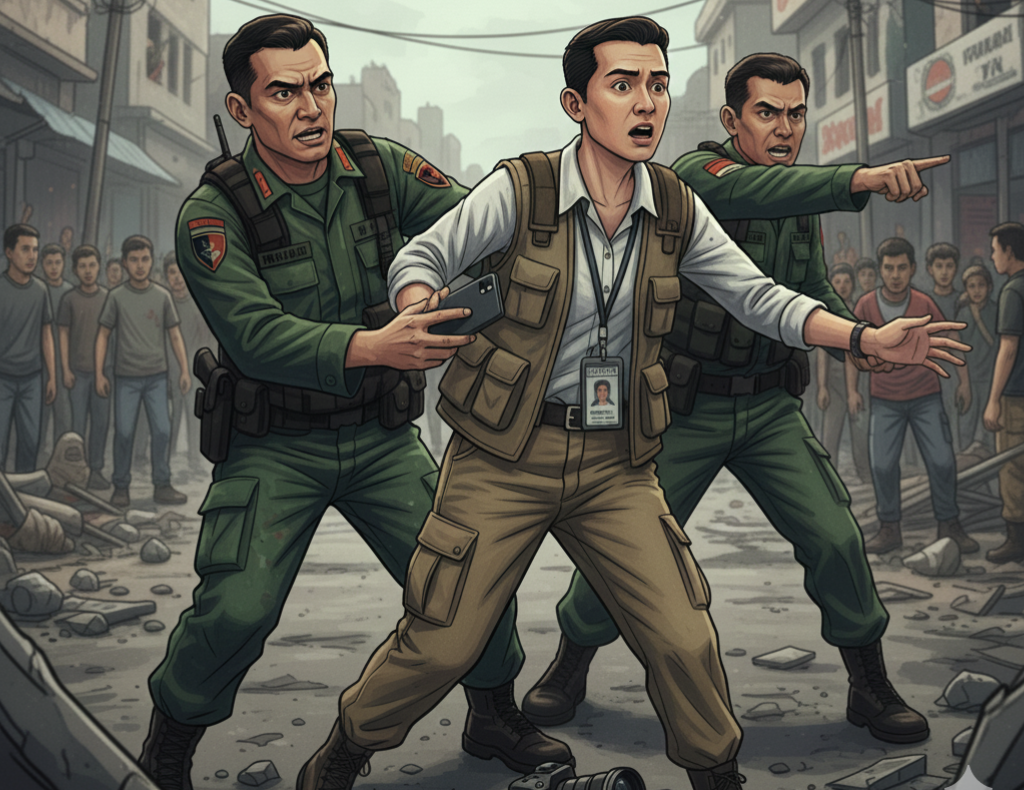 Ilustrasi perampasan ponsel wartawan oleh oknum TNI saat melakukan peliputa. (Foto: Gemini AI)