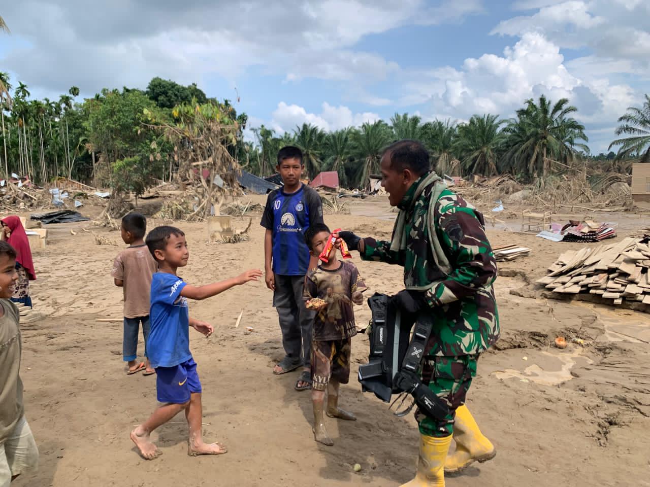 Kodim 0103/Aceh Utara, Letkol Arh Jamal Dani Arifin, membagikan makanan ringan kepada anak-anak Desa Lubok Pusaka, Kecamatan Langkahan, Kabupaten Aceh Utara. (Ist)