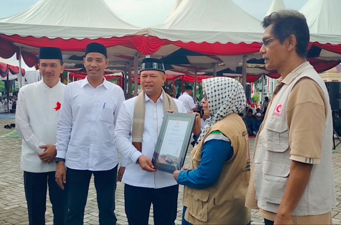 Dalam prosesi penyerahan simbolis, Bupati Ayahwa didampingi Wakil Bupati Tarmizi Panyang, S.I.Kom, dan Kepala Dinas Pendidikan dan Kebudayaan Aceh Utara Jamaluddin, M.Pd., menyerahkan bantuan kepada perwakilan MER-C Indonesia yang hadir secara khusus di lokasi kegiatan.