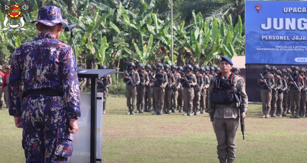 Personel Satuan Brimob Polda Aceh menuntaskan latihan Jungle Warfare yang digelar di kawasan PTPN Cot Girek, Aceh Utara. Upacara penutupan dipimpin Dirpolairud Polda Aceh Brigjen Pol. Wahyu Prihatmaka, Selasa, 28 April 2026. [Foto: Humas Brimobda Aceh]