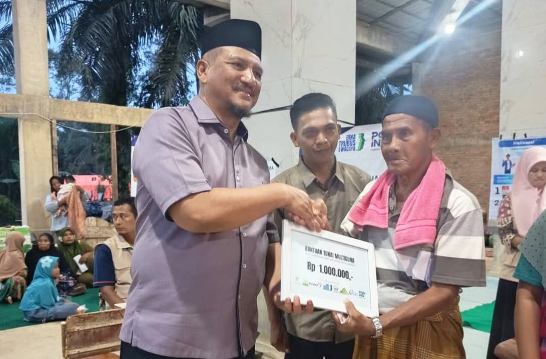 Penyerahan bantuan dilakukan secara simbolis di Masjid Babut Taqwa, Kampung Pematang Durian, Kecamatan Sekerak.