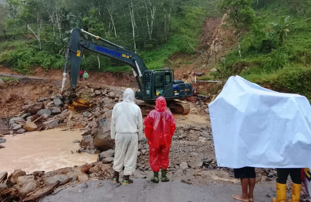 Meski kondisi medan licin dan cuaca kurang bersahabat, personel TNI tetap berupaya menyelesaikan pekerjaan demi memastikan akses warga segera pulih.