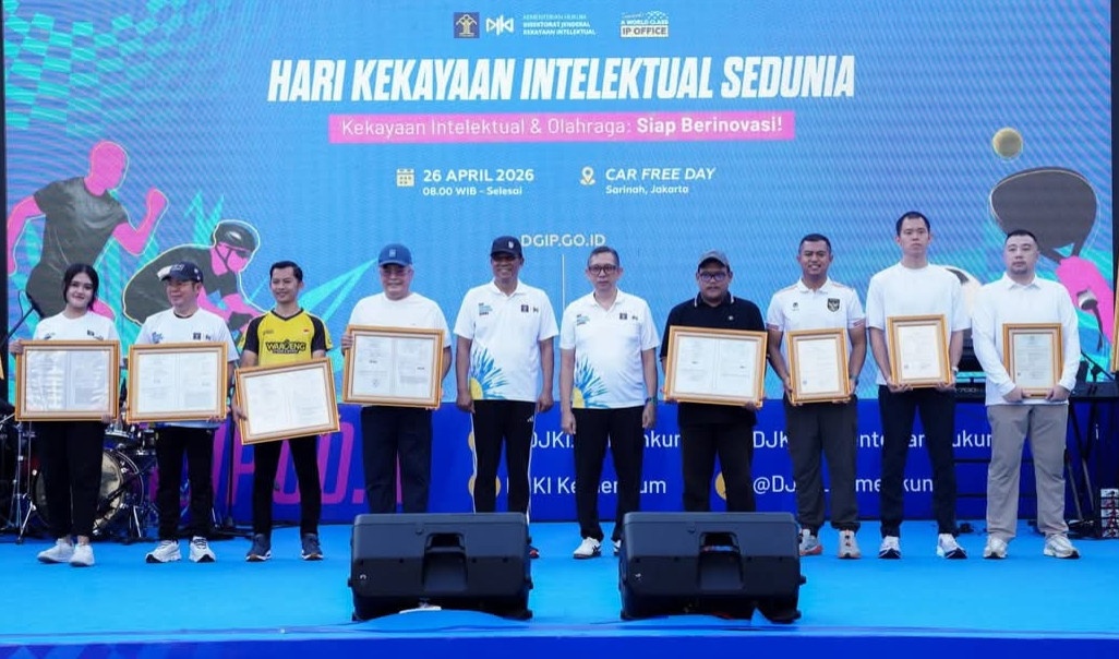 Byklik.com | Jakarta – Direktorat Jenderal Kekayaan Intelektual (DJKI) Kementerian Hukum menyerahkan sembilan sertifikat kekayaan intelektual (KI) kepada para pemegang hak dalam rangka memperingati Hari Kekayaan Intelektual (KI) Sedunia 2026. Kegiatan tersebut digelar di Anjungan Sarinah, Jakarta Pusat, pada 26 April 2026.