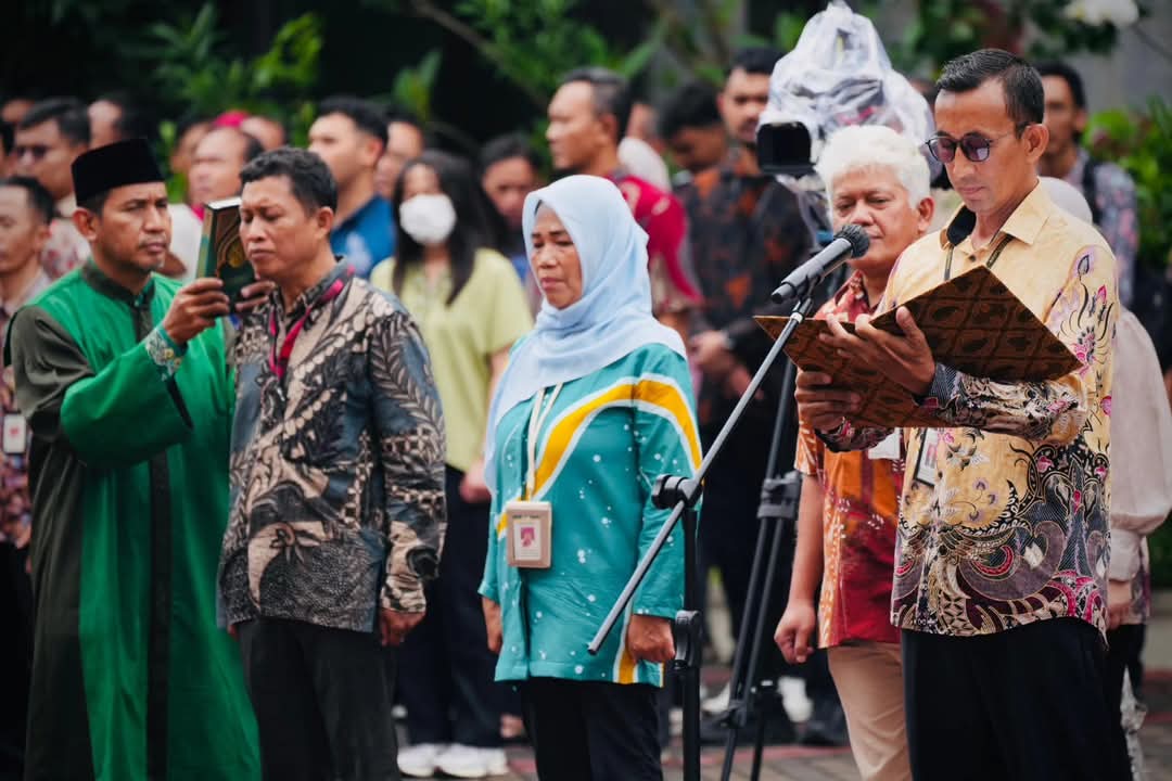 Apel dilaksanakan secara hybrid. Pegawai kantor pusat mengikuti apel di Jalan Salemba, Jakarta, sementara pegawai di daerah mengikuti apel di lokasi masing-masing.
