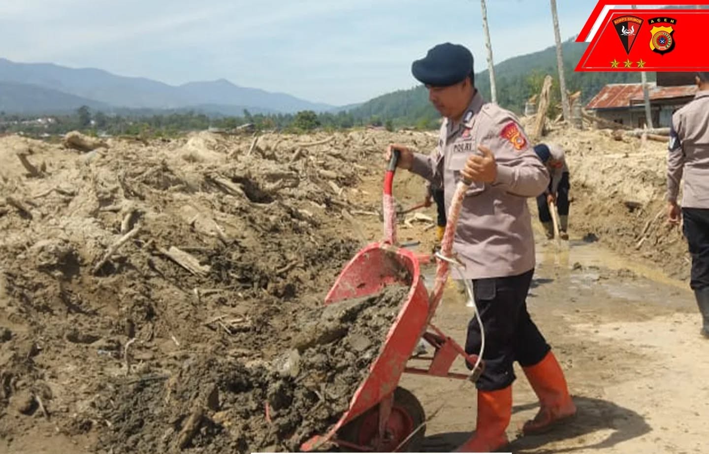 “Sudah lebih sebulan jalan ini tertutup lumpur. Kami kesulitan beraktivitas. Kehadiran Brimob Aceh sangat membantu, mereka bekerja tanpa lelah meski alatnya terbatas,” katanya.