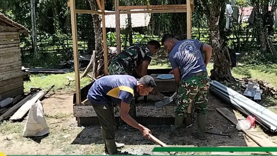 Pembangunan jamban tersebut dilakukan secara gotong royong oleh personel Satgas TMMD bersama masyarakat setempat.