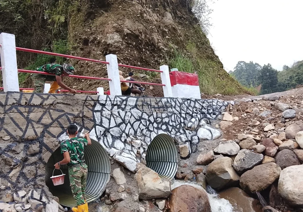Pada tahap finishing, personel Koramil 04/PRG Kodim 0119/BM melakukan pengecatan serta pengecekan menyeluruh terhadap konstruksi jembatan guna memastikan kekuatan dan keamanannya.
