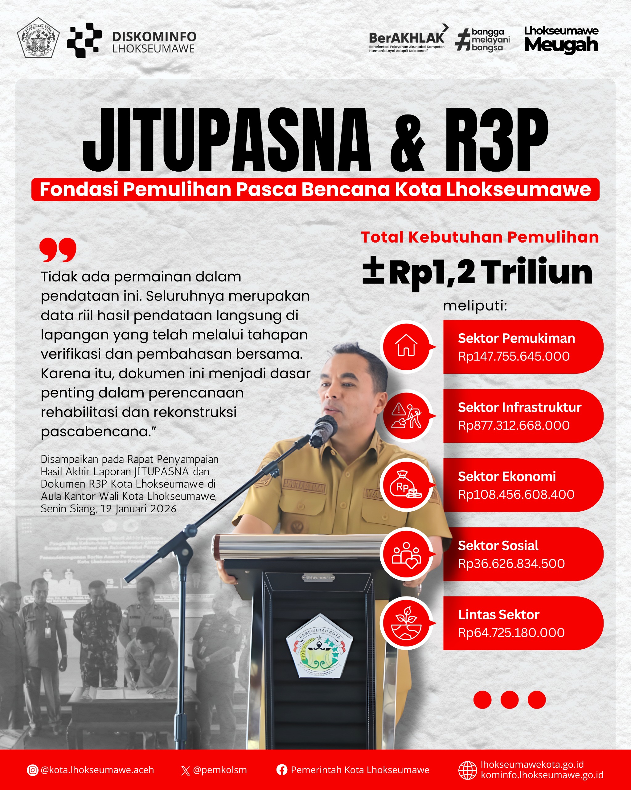 Pemerintah Kota Lhokseumawe juga menegaskan bahwa nilai kebutuhan yang tercantum dalam JITUPASNA dan R3P tidak seluruhnya dibiayai dalam satu waktu atau dari satu sumber anggaran. Dokumen ini menjadi acuan perencanaan dan pengusulan pendanaan secara bertahap melalui sinergi pemerintah daerah, Pemerintah Provinsi Aceh, dan Pemerintah Pusat.