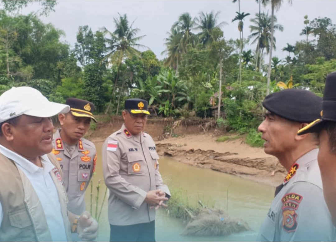 Kapolda Aceh, Marzuki Ali Basyah, didampingi Bupati Bireuen, Mukhlis, meninjau langsung lokasi jembatan putus yang menghubungkan Desa Meunasah Tambo dan Desa Meunasah Keutapang, Kecamatan Jeunieb, Kabupaten Bireuen, Kamis, 19 Februari 2026. (Ist)