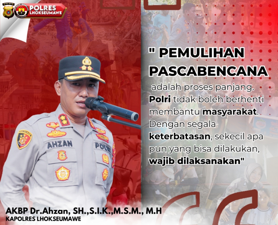 Byklik.com | Lhokseumawe – Kapolres Lhokseumawe AKBP Dr. Ahzan menegaskan bahwa pemulihan pascabencana merupakan proses jangka panjang yang membutuhkan keterlibatan berkelanjutan dari seluruh pihak, termasuk Kepolisian Negara Republik Indonesia (Polri).