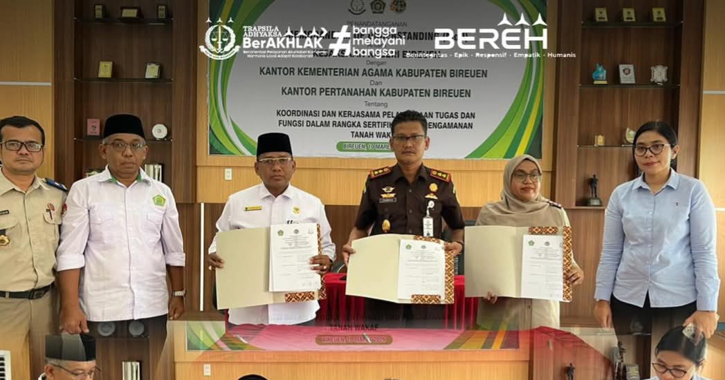 Penandatanganan kerja sama tersebut berlangsung di Aula Kantor Kejari Bireuen, Selasa, 10 Maret 2026. MoU ditandatangani oleh Kepala Kejaksaan Negeri Bireuen, Yarnes, bersama Kepala Kantor Kementerian Agama Kabupaten Bireuen, Zulkifli, serta perwakilan Kantor Pertanahan Kabupaten Bireuen.
