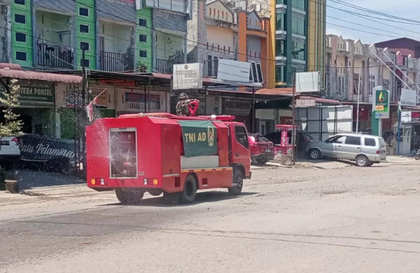 Kodim 0102/Pidie mengerahkan armada pemadam kebakaran milik TNI AD untuk menyiram jalan lintas di kawasan Meureudu, Senin, 23 Maret 2026. [Foto: Pendim 0102/Pidie]