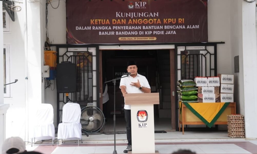 Byklik.com | Meureudu – Komisi Pemilihan Umum (KPU) Republik Indonesia menyerahkan bantuan kemanusiaan melalui program KPU Peduli kepada korban banjir Pidie Jaya, Provinsi Aceh. Penyerahan dilakukan secara simbolis di Kantor KPU Pidie Jaya pada Senin, 29 Desember 2025.