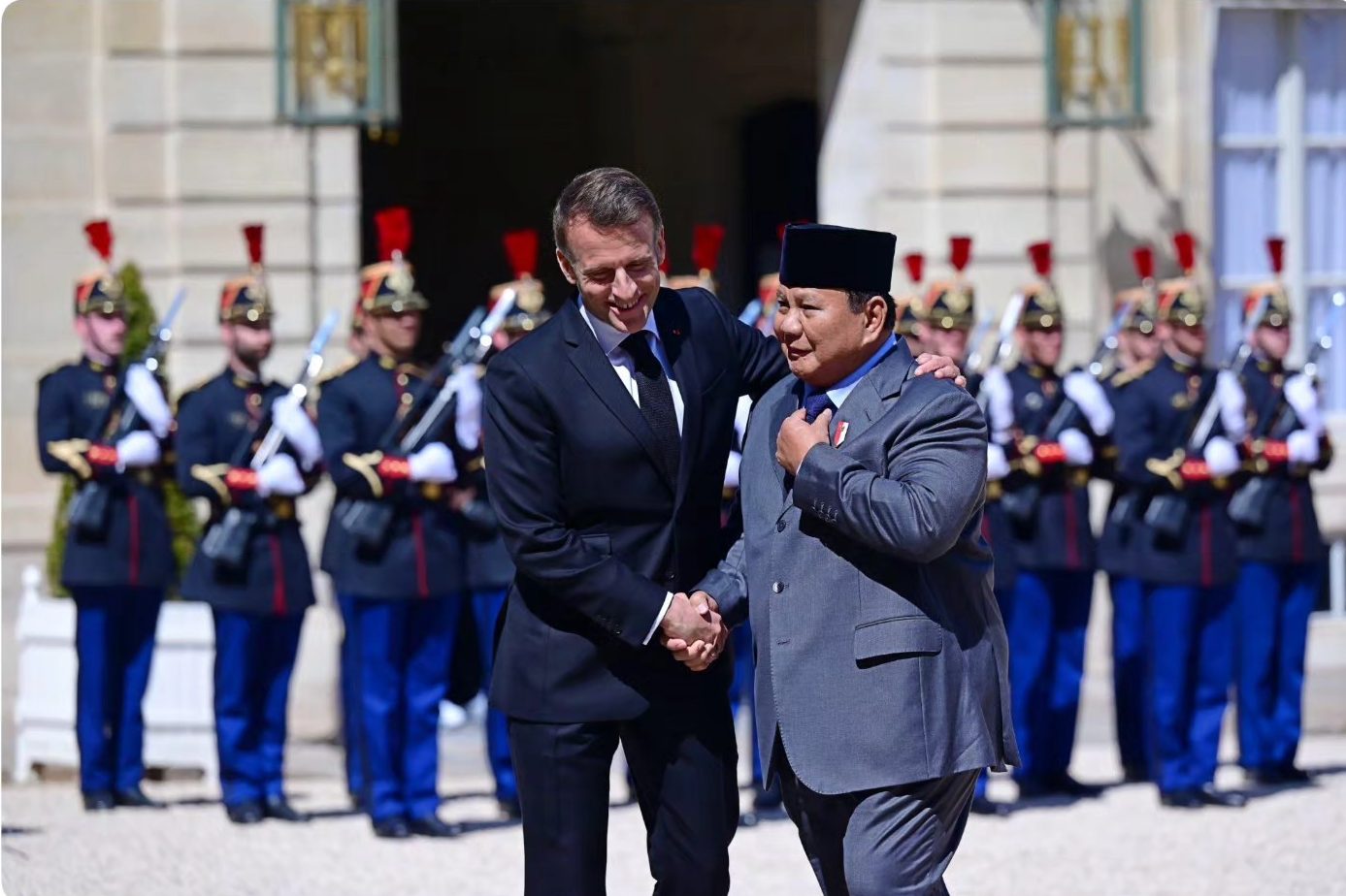 Prabowo tiba di Istana Élysée dan disambut langsung oleh Presiden Macron dengan upacara kehormatan militer. Keduanya sempat berbincang singkat sebelum melanjutkan ke ruang pertemuan Les Salon des Portraits untuk agenda tertutup.