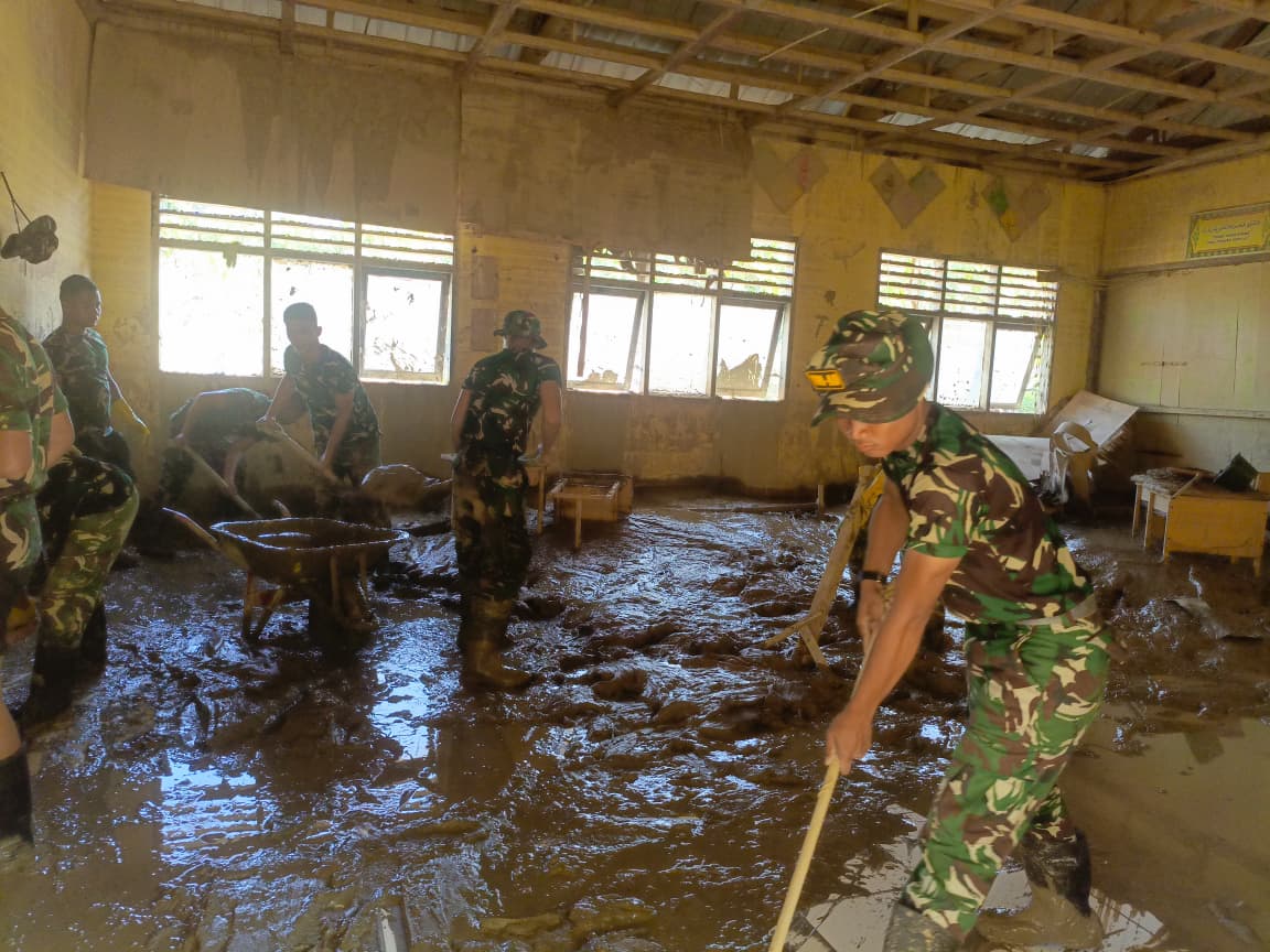 Personel TNI membersihkan material lumpur di SMP Negeri 09 Tanjung Gelumpang, Kecamatan Sekerak, Kabupaten Aceh Tamiang, Minggu, 18 Januari 2026. [Foto: Pendim Aceh Tengah]