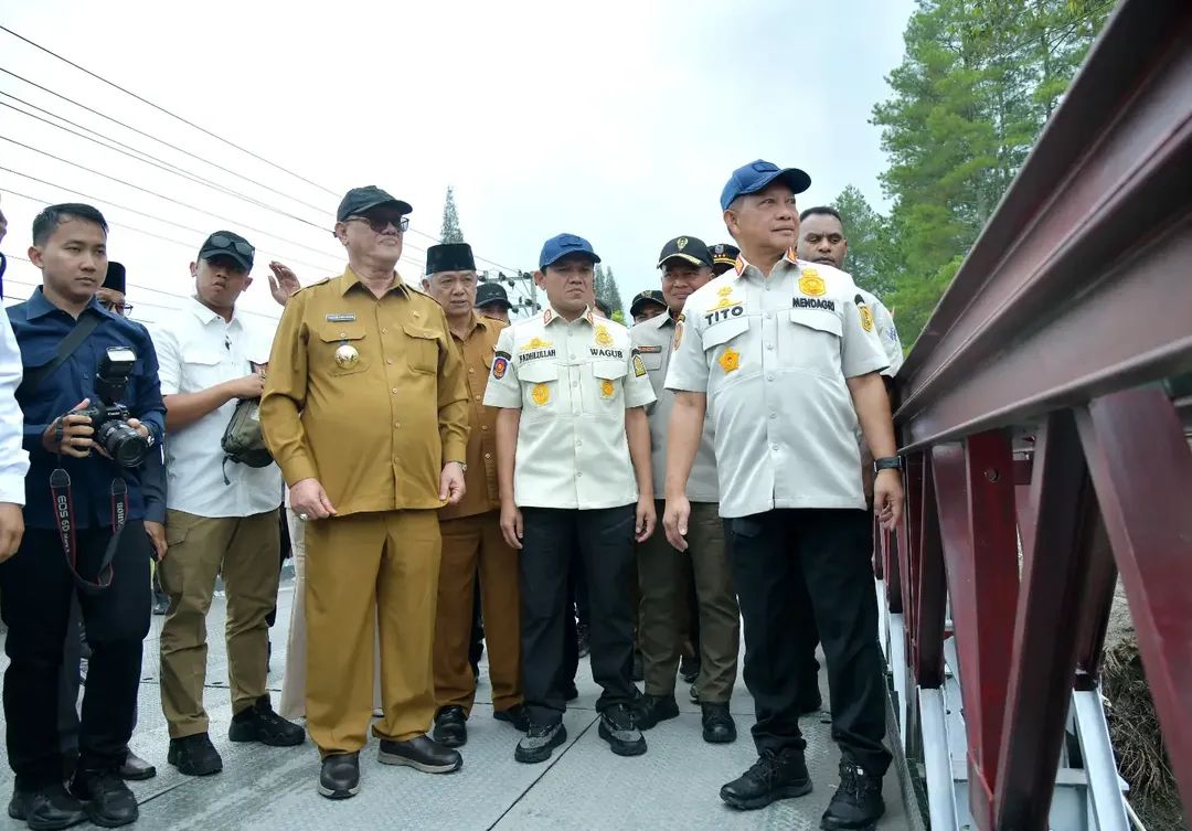 Usai dari lokasi huntara, rombongan melanjutkan peninjauan ke Jembatan Bailey yang menjadi salah satu akses vital masyarakat setempat pascabencana.