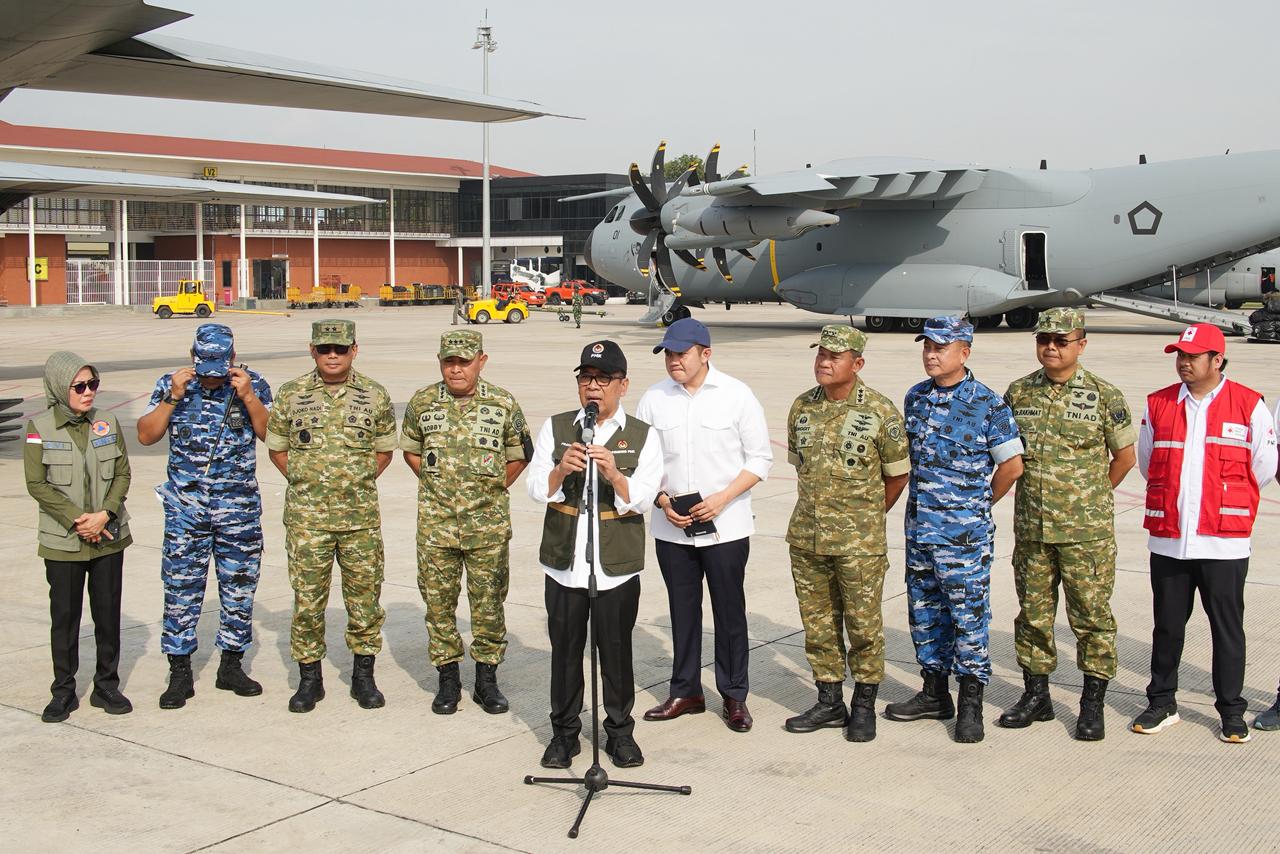 Menteri Koordinator Bidang Pembangunan Manusia dan Kebudayaan (Menko PMK) Pratikno memimpin pelepasan bantuan darurat untuk penanganan banjir dan tanah longsor yang melanda Aceh, Sumatra Utara, dan Sumatra Barat di Bandara Halim Perdanakusuma, Jakarta, pada Jumat (28/11/2025). [Foto: Kemenko PMK]