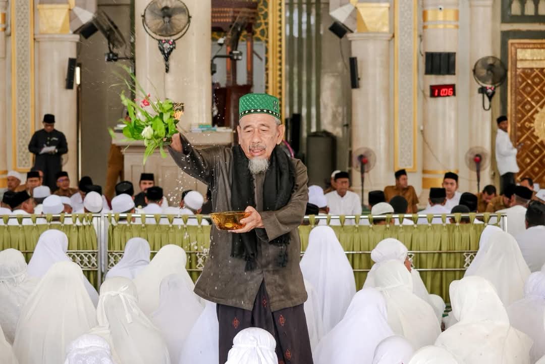 Tgk Abdul Wahab yang dikenal sebagai Abu Keude Dua melakukan prosesi peusijuek (tepung tawar) terhadap 249 calon jemaah haji Kabupaten Aceh Timur, di Masjid Agung Darussalihin Idi, Selasa, 28 April 2026. (Foto: Pemkab Aceh Timur)
