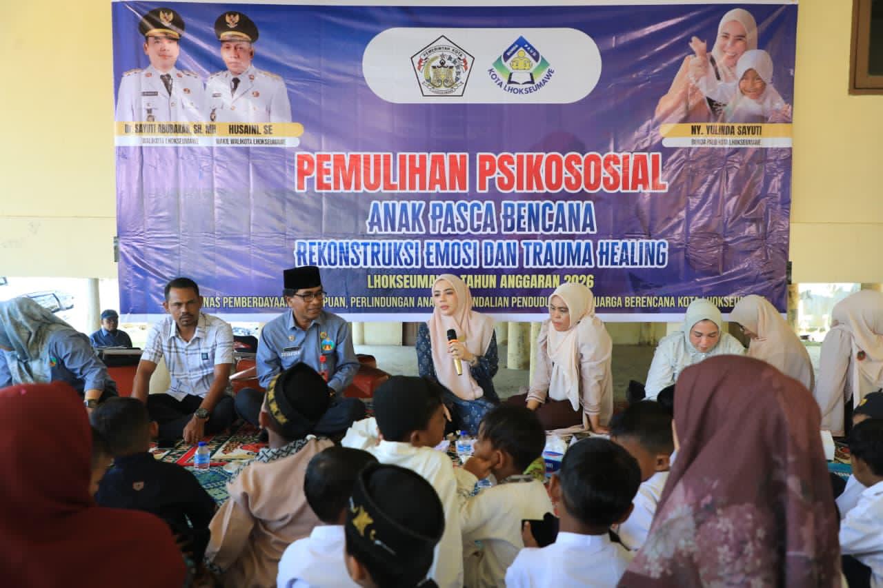 Byklik.com | Lhokseumawe – Pemerintah Kota Lhokseumawe melalui Dinas Pemberdayaan Perempuan dan Perlindungan Anak, Pengendalian Penduduk dan Keluarga Berencana (DP3AP2KB) bersama Kelompok Kerja (Pokja) Bunda PAUD Kota Lhokseumawe melaksanakan kegiatan trauma healing bagi anak-anak tetdampak banjir di Gampong Ujong Pacu, Jumat, 24 April 2026.