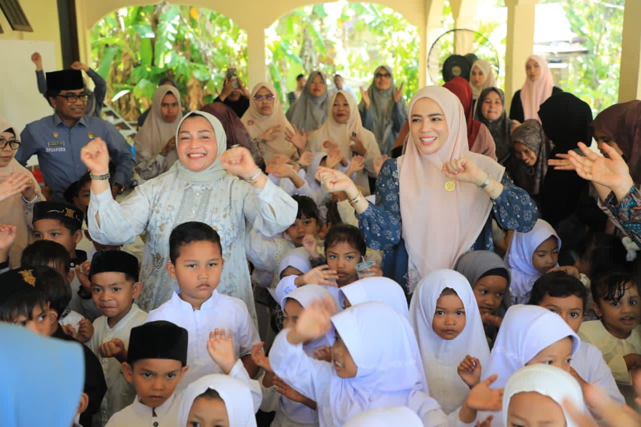 Bunda PAUD Kota Lhokseumawe, Ny. Yulinda Sayuti, berinteraksi langsung dengan anak-anak Gampong Ujong Pacu dan Cot Trieng yang terdampak banjir, Jumat, 24 Oktober 2026. (Foto: Prokopim Pemko Lhokseumawe)