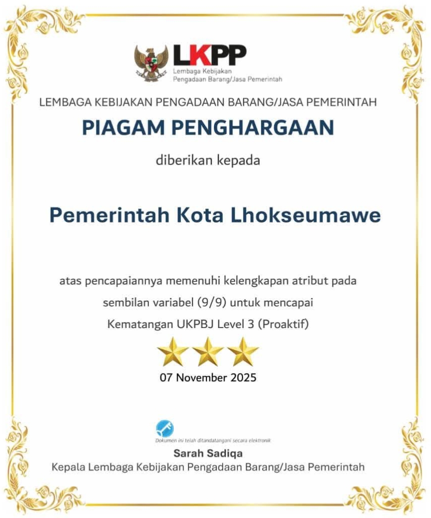 Berdasarkan Surat LKPP Nomor 25066/KA/11/2025, UKPBJ Pemerintah Kota Lhokseumawe kini berpeluang mengajukan penilaian sebagai Pusat Keunggulan Pengadaan Barang/Jasa pada level Proaktif, paling cepat satu tahun setelah penghargaan diterbitkan.