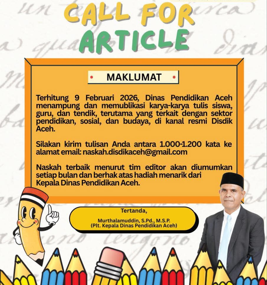 Melalui program Call for Article ini, Dinas Pendidikan Aceh mengajak seluruh insan pendidikan untuk aktif menyuarakan gagasan dan berkontribusi dalam upaya memajukan pendidikan Aceh melalui karya tulis.***