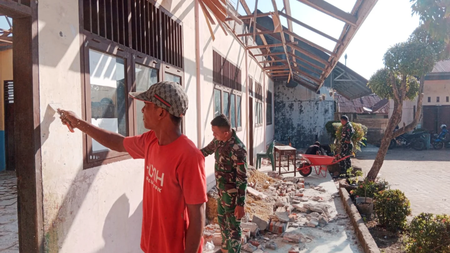 Di lapangan, Babinsa Serda Yusmeri turun langsung mendampingi proses pekerjaan yang diawali dengan pembongkaran atap dan plafon bangunan yang telah rusak. Para pekerja terlihat membuka lembaran seng lama secara bertahap dengan hati-hati.