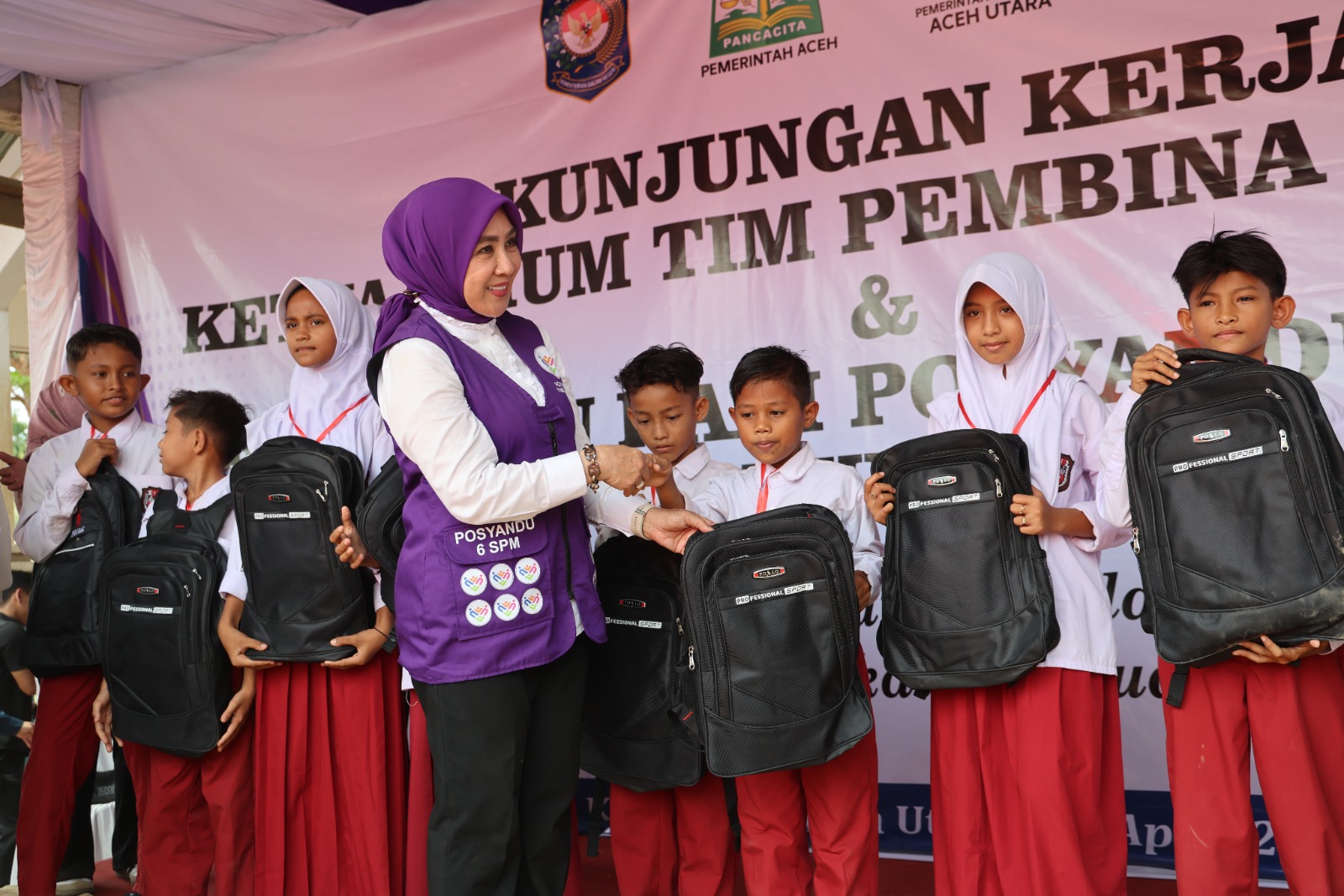 Ketua Umum Posyandu yang juga Ketua Tim Penggerak PKK Pusat, Ny. Tri Suswati Tito Karnavian, memberikan bantuan perlengkapan sekolah kepada pelajar sekolah dasar yang tinggal di huntara Gampong Geudumbak, Kecamatan Langkahan, Rabu, 29 April 2026. (Foto: Diskominsa Aceh Utara)