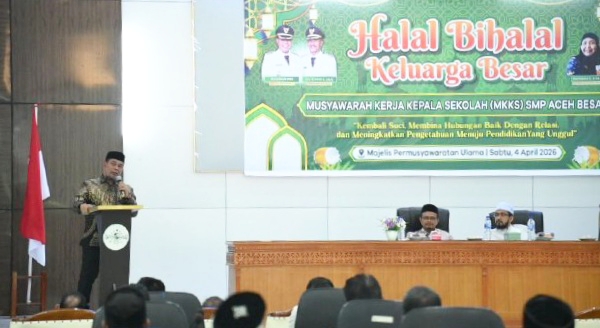 Hal itu disampaikan dalam rapat kerja Musyawarah Kerja Kepala Sekolah (MKKS) SMP Aceh Besar, yang juga menjadi ajang halal bi halal, di Aula Kantor MPU Aceh, Kecamatan Darul Imarah, Sabtu, 4 April 2026.