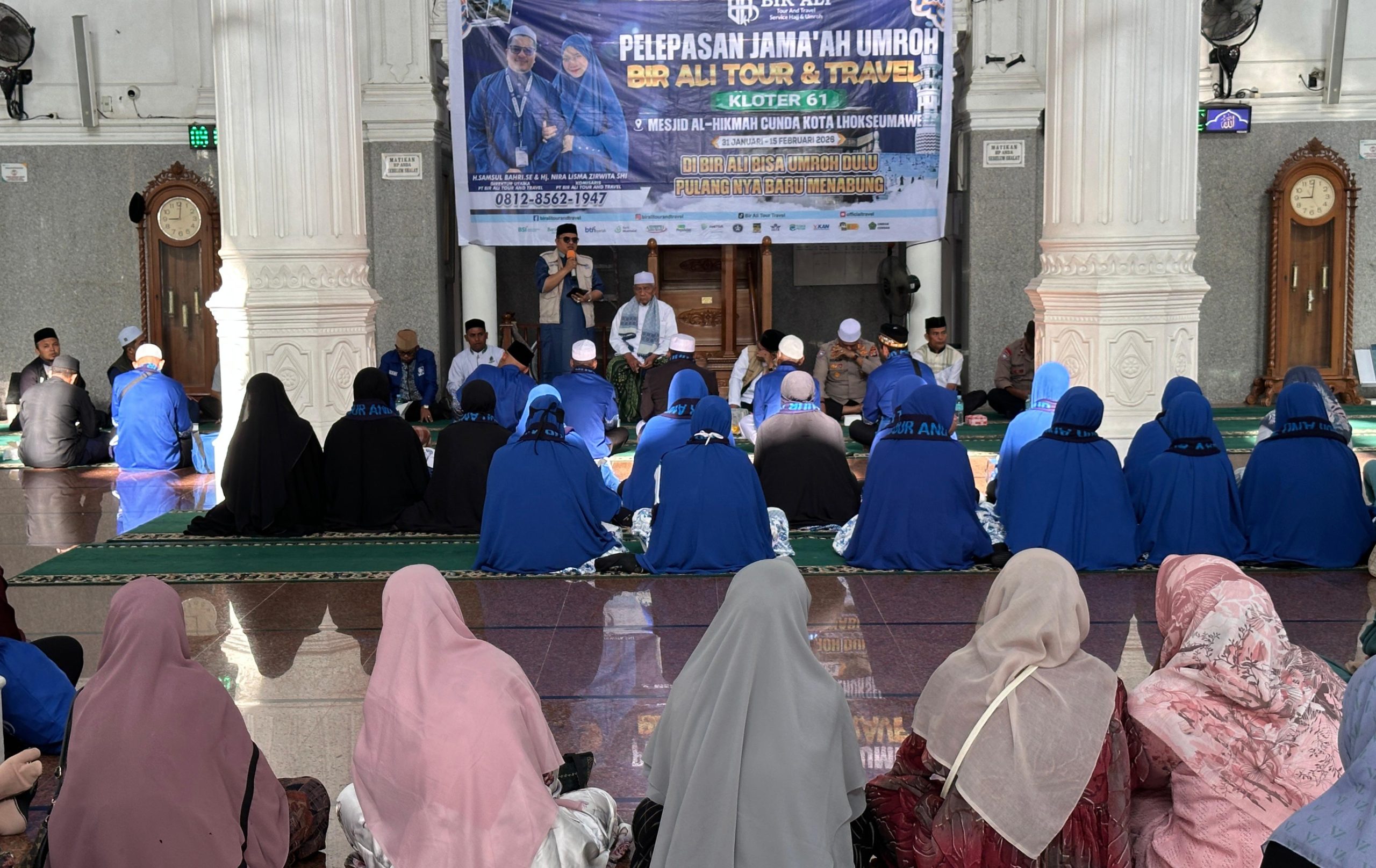 Byklik.com | Lhokseumawe – Suasana haru dan khidmat menyelimuti pelepasan Jamaah Umrah Kloter 61 PT Bir Ali Tour and Travel yang berlangsung di Masjid Al-Hikmah Cunda, Kota Lhokseumawe, Sabtu, 31 Januari 2026.