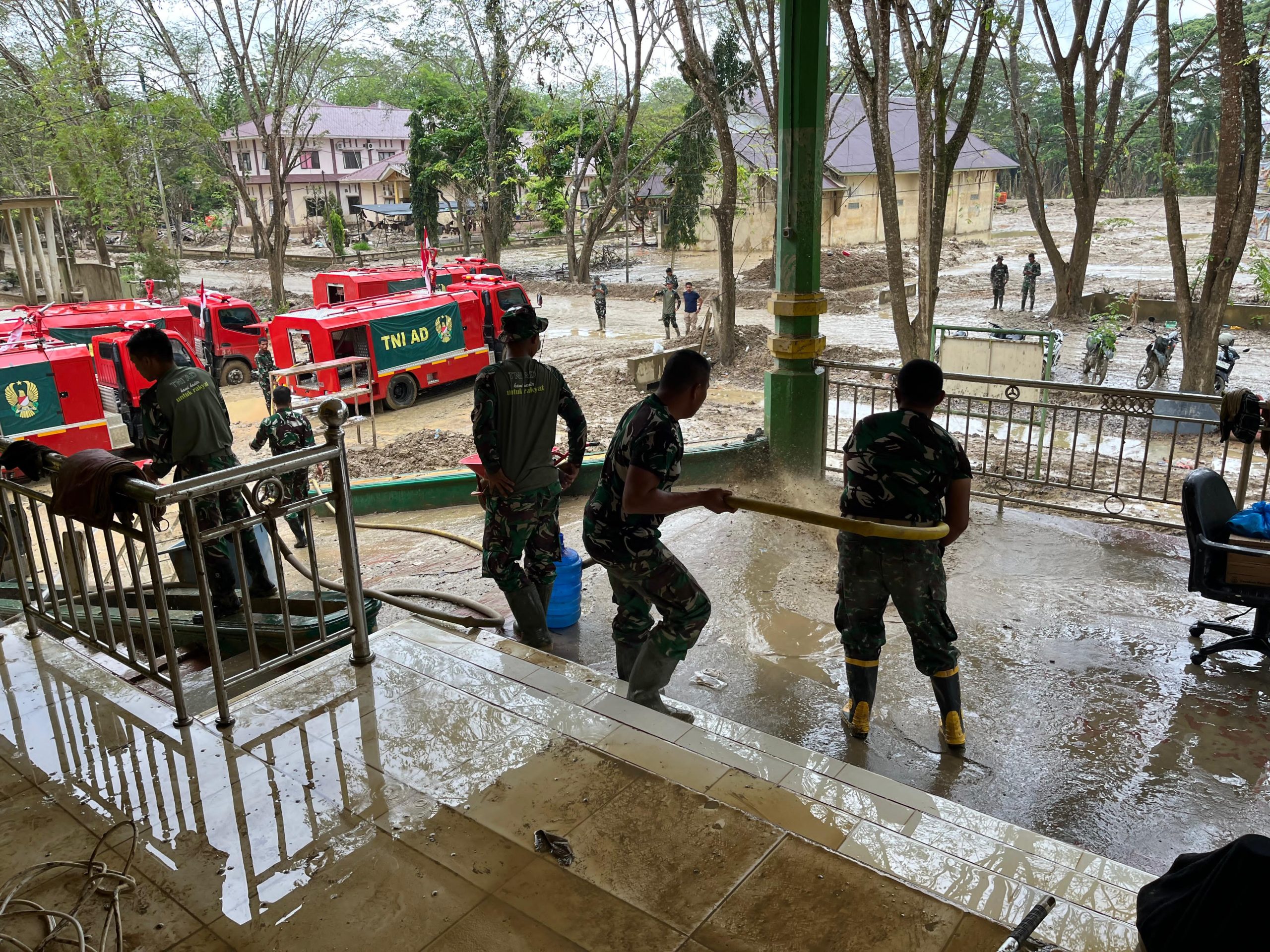 Dalam kegiatan tersebut, TNI mengerahkan enam unit mobil pemadam kebakaran untuk menyemprot lumpur, endapan pasir, serta sampah yang menutupi area kantor. Pembersihan dilakukan guna mempercepat pemulihan fasilitas umum strategis agar aktivitas pemerintahan dapat kembali berjalan normal.