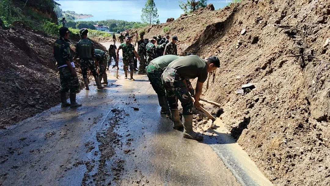 Dengan peralatan seadanya, personel TNI bersama warga bahu-membahu menyingkirkan material longsor agar jalan kembali bisa dilalui.