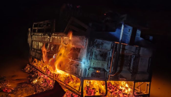 Byklik | Lhoksukon–Sebuah truk penyalur bantuan logistik milik Satpol PP Kabupaten Aceh Utara dibakar massa di Gampong Pante Gaki Bale, Kecamatan Langkahan, pada Rabu, 10 Desember 2025 Insiden tersebut terjadi sekitar pukul 19.30 WIB setelah terjadi ketegangan antara warga dan sopir truk.