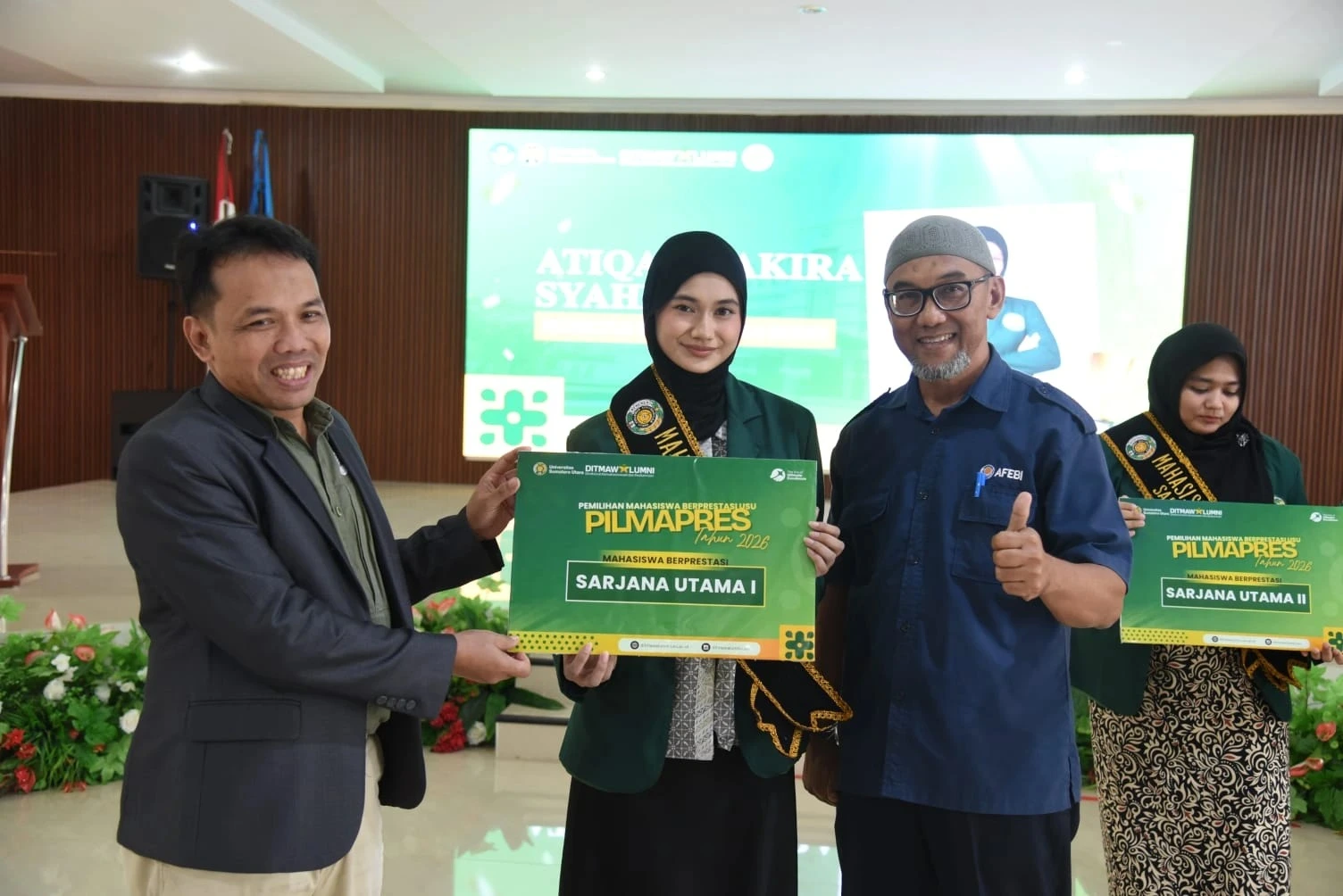 Untuk jenjang sarjana, juara pertama diraih oleh Atiqa Zhakira Syahrul dari Fakultas Ekonomi dan Bisnis. Posisi kedua ditempati Siti Nur Salsabila dari Fakultas Ilmu Komputer dan Teknologi Informasi, sementara juara ketiga diraih Vanecia Thania Ruth Pakpahan dari Fakultas Kesehatan Masyarakat.