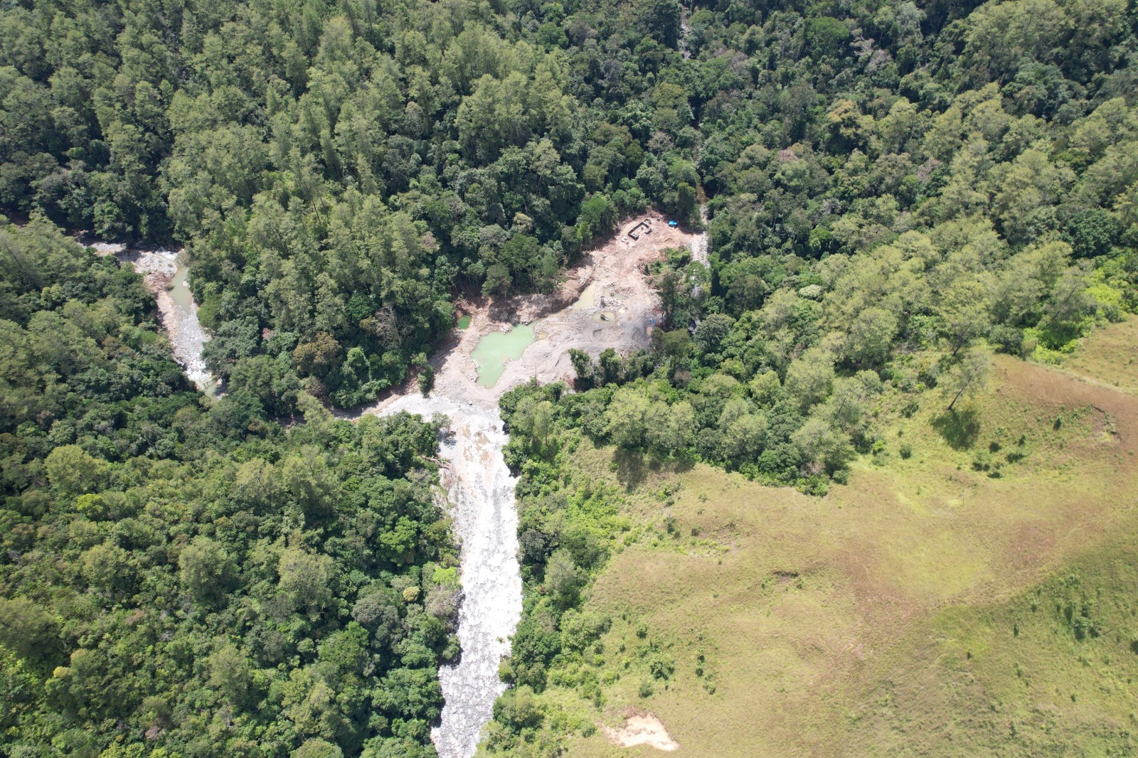 Hasil pemetaan menggunakan drone menunjukkan adanya aktivitas pertambangan ilegal di wilayah Sungai Abah Krueng Ila dengan luas mencapai sekitar ±1,32 hektare. Temuan ini diperkuat dengan analisis citra satelit Copernicus Sentinel-2 L2A tertanggal 13 Januari 2026, yang sebelumnya menunjukkan area tersebut masih tertutup vegetasi alami.