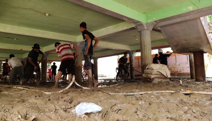 Byklik | Meureudu—Masyarakat Gampong Babah Krueng, Kecamatan Bandar Dua, Kabupaten Pidie Jaya dibantu oleh para relawan pramuka bergotong royong membersihkan pekarangan meunasah dari lapisan lumpur yang sudah mengering, Rabu, 10 Desember 2025.