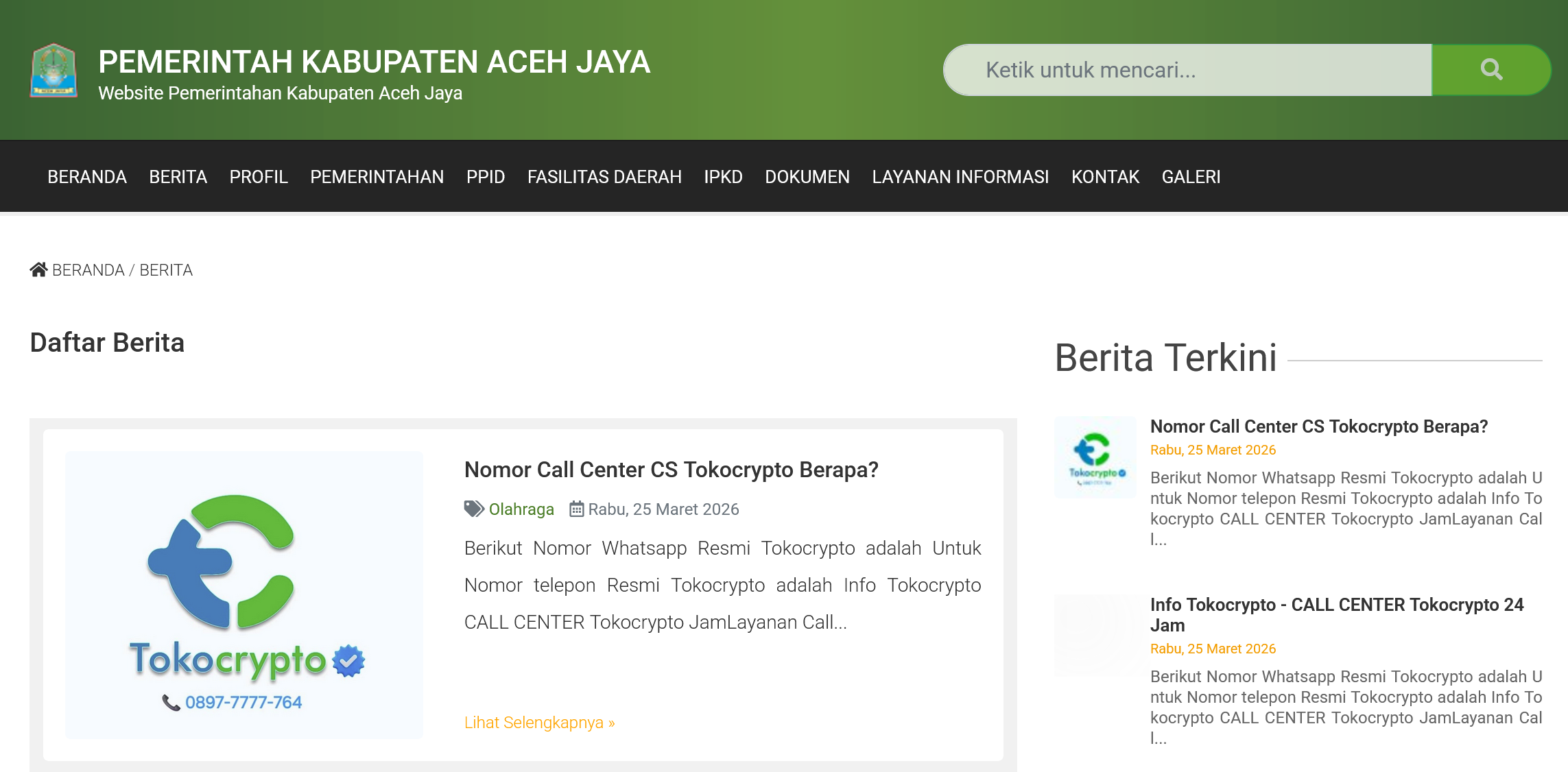 Byklik.com | Calang – Situs resmi Pemerintah Kabupaten Aceh Jaya pada laman berita terpantau menampilkan konten yang tidak berkaitan dengan aktivitas pemerintahan daerah. Sejumlah artikel yang muncul justru didominasi topik Tokocrypto dan Kopra Mandiri.