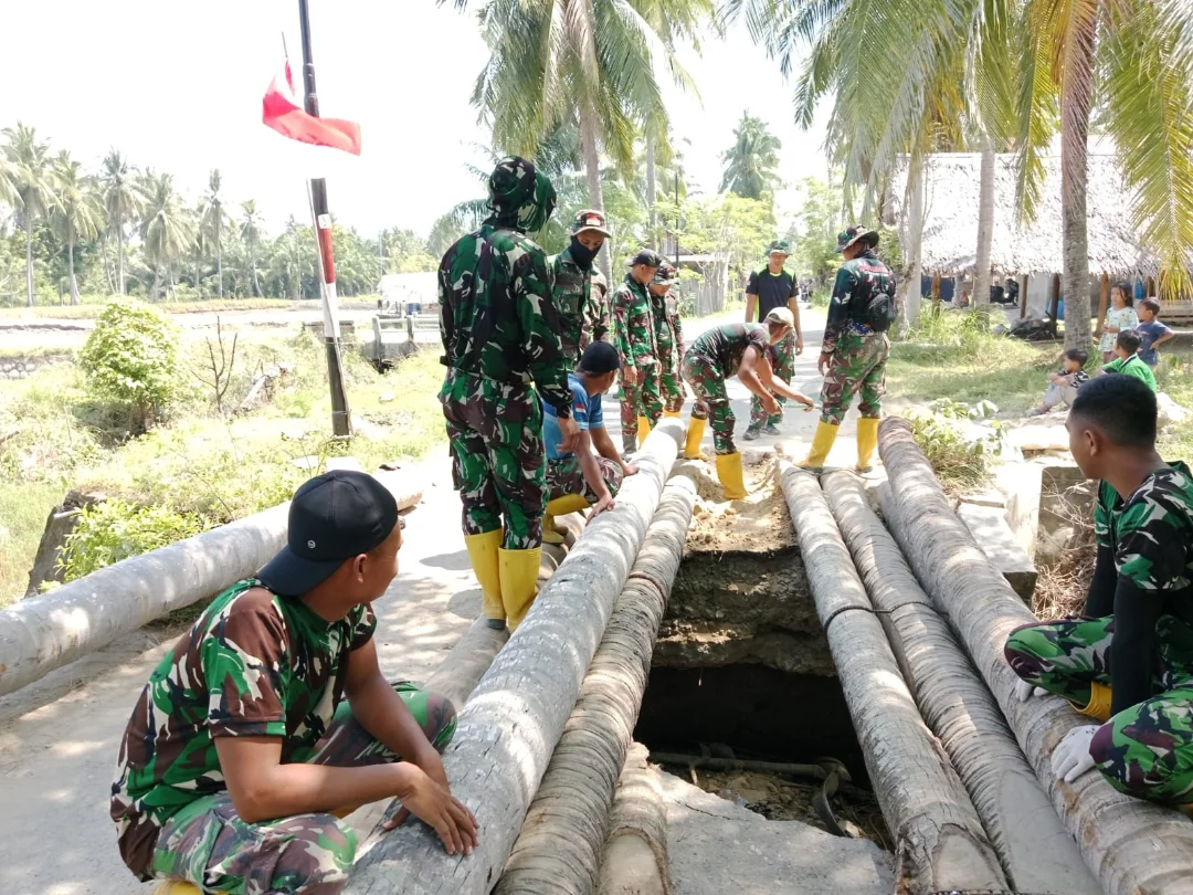 Dalam proses perbaikan darurat, personel TNI memanfaatkan batang pohon kelapa sebagai penyangga sementara. Material tersebut disusun dan diikat secara bertahap untuk memperkuat struktur jembatan agar aman dilintasi pejalan kaki maupun kendaraan ringan.